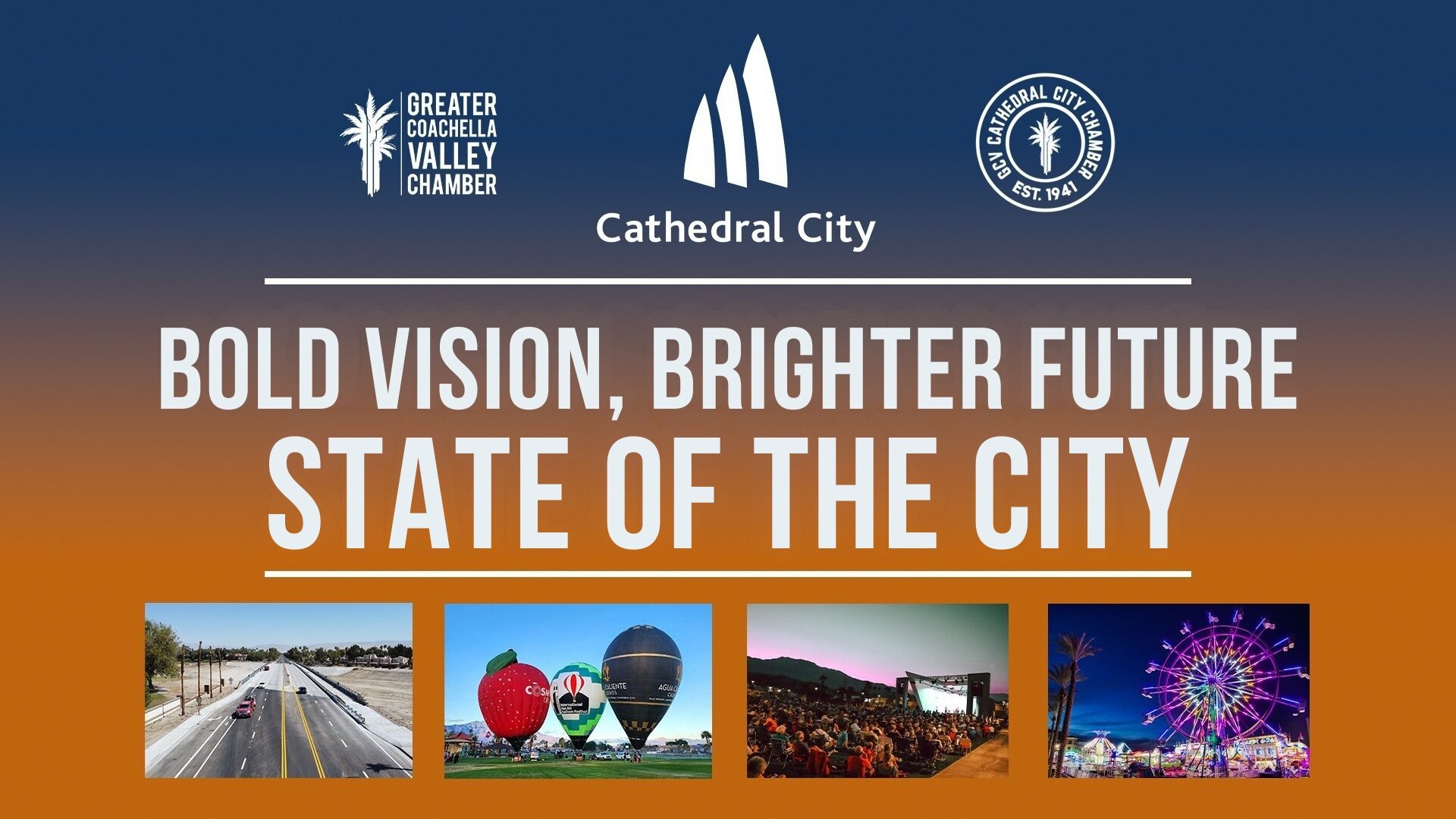 The Greater Coachella Valley Chamber of Commerce, in partnership with the City of Cathedral City, invites you to attend the 2025 Cathedral City State of the City, Business Awards and Business Expo. This year’s theme will be Bold Vision, Brighter Future.