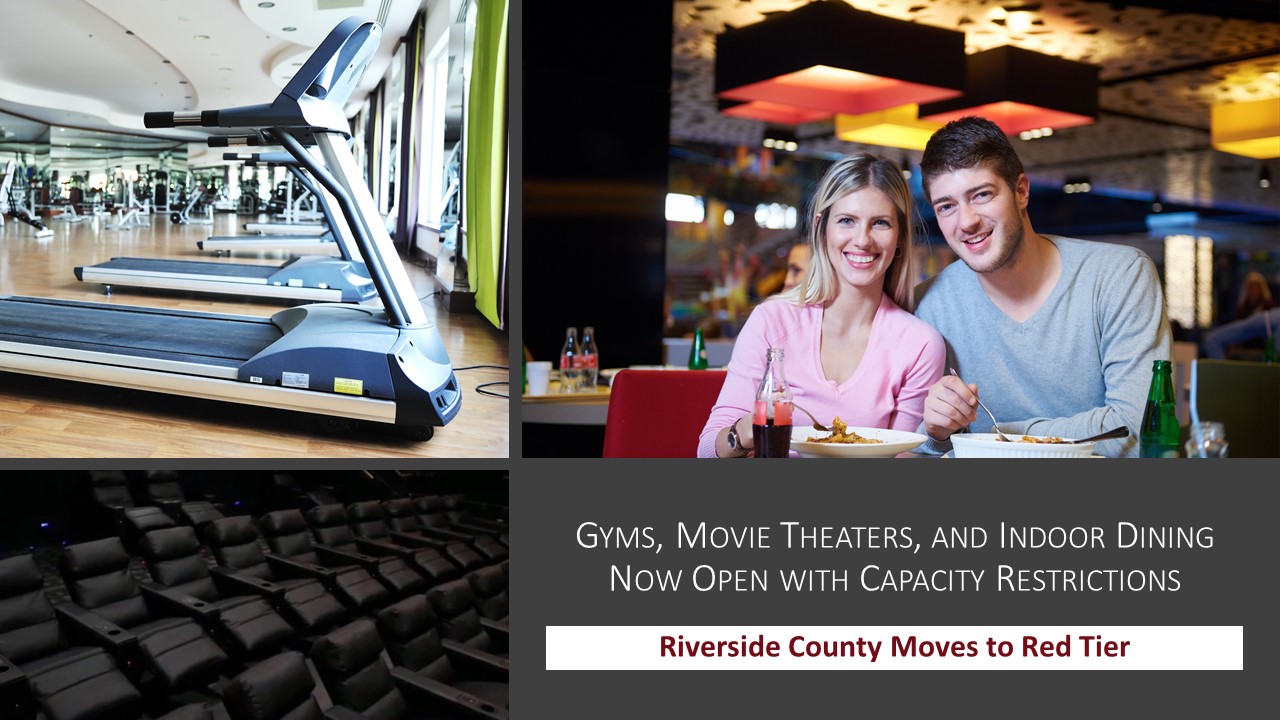The state announced that Riverside County can move to the less restrictive “Red – Substantial” tier starting Wednesday, March 17th.  Please know the Red Tier means that the coronavirus is still substantial for community spread and everyone should continue doing their part to wear a face covering and social distance between you and others outside of your household.  To find the latest information and/or other categories not listed, go to the Governor’s Blueprint for a Safer Economy at www.COVID19.CA.GOV.