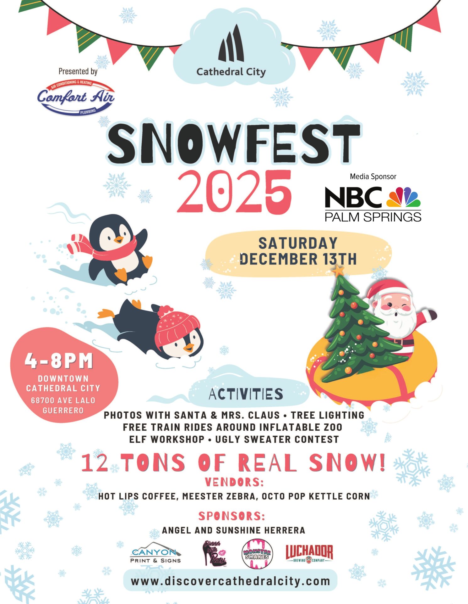 SnowFest is presented by Comfort Air, with additional support from Canyon Print & Signs (Tree Sponsor), Angel & Sunshine Herrera (Snow Sponsor), Dinner with Patsi, Monster Shakes, and Luchador Brewing Company (Santa Sponsors). NBC Palm Springs is the official media sponsor.