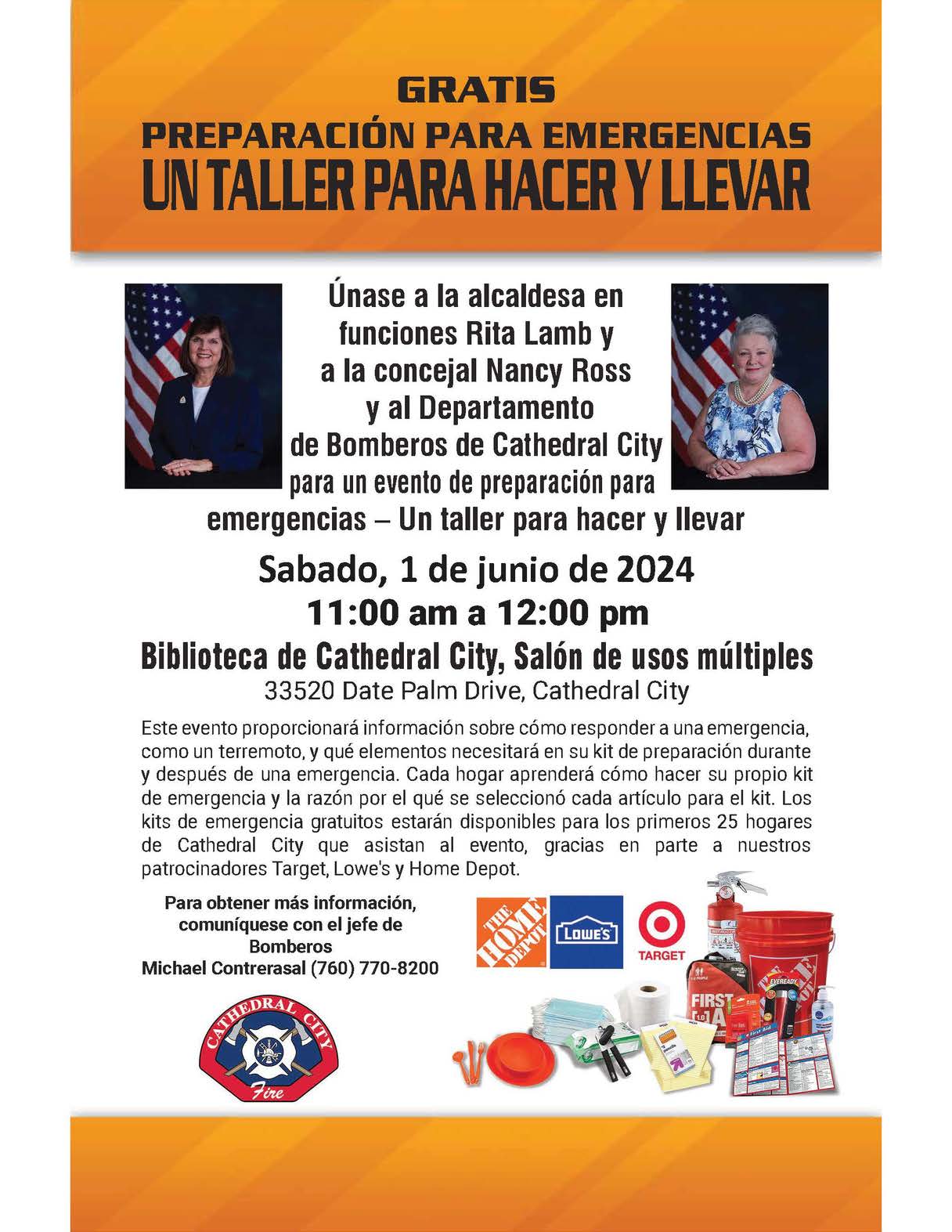 Join Mayor Pro Tem Nancy Ross, Councilmember Rita Lamb, and the Cathedral City Fire Department for an Emergency Preparedness – Grab & Go Event from 11 a.m. to noon on Saturday, June 1, 2024, at the Cathedral City Library, Multi-Purpose Room, 33520 Date Palm Drive, Cathedral City.