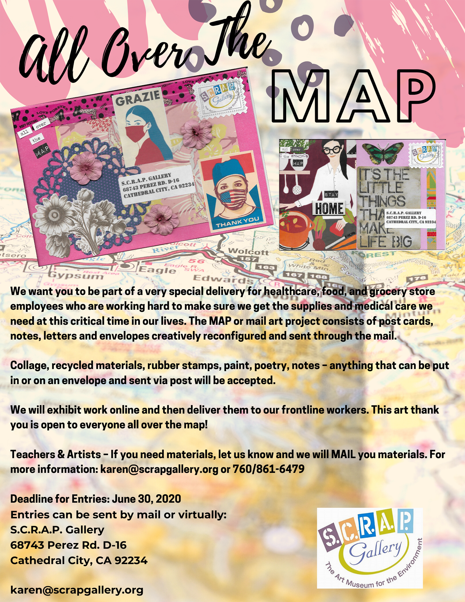 S.C.R.A.P. Gallery is offering a free kids’ art project that utilizes recycled materials to send a special “thank you” to frontline workers such as healthcare, food, and grocery store workers. Entitled, “All Over the Map,” children will use paint, poetry, notes, postcards, rubber stamps, etc. to make these special messages.