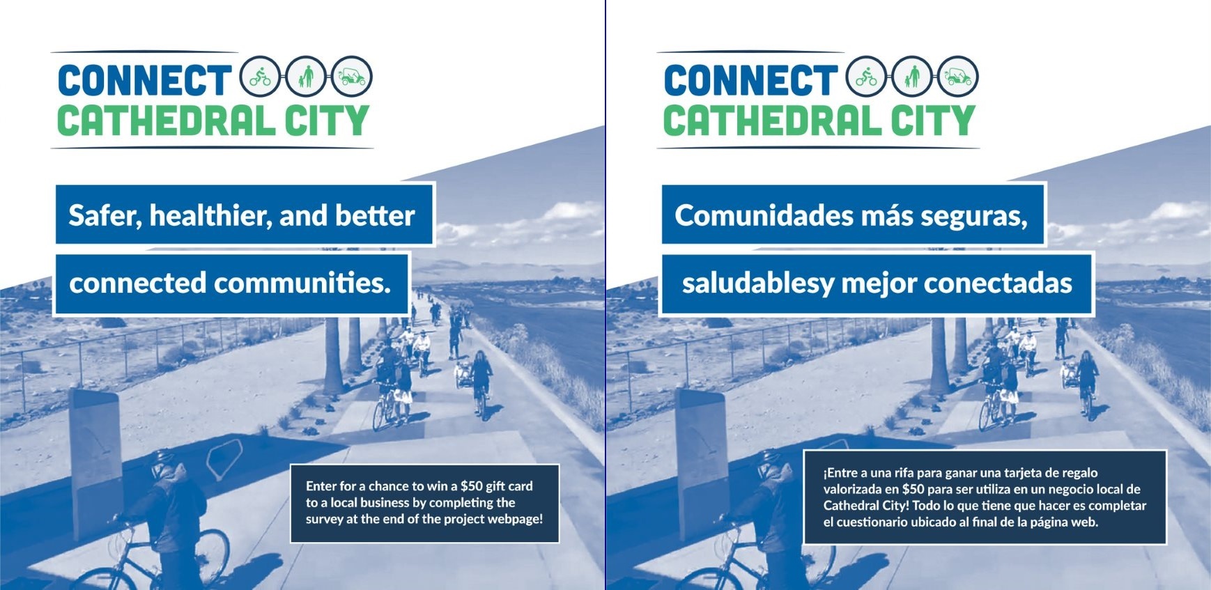 Healthier communities also mean having increased opportunities for physical activity. How that will look may be different in the future, but having access to quality and connected walking and biking facilities still remains an important priority. Learn more about four potential projects that aim to make walking, biking, and driving low-speed vehicles like golf carts easier and safer in Cathedral City. Help us Connect Cathedral City.