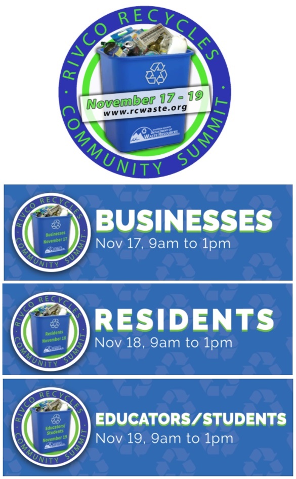 The Riverside County Department of Waste Resources invites you to join them for the RivCo Recycles Community Summit, a virtual discussion about recycling, taking place November 17 – 19.