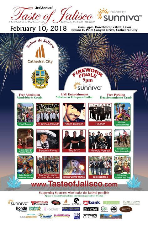The 3rd Annual Taste of Jalisco, presented by Sunniva, Inc., celebrates the sister city relationship between the cities of Cathedral City, California (USA) and Tequila, Jalisco (Mexico) through music, fashion, spirits, culture and cuisine. It is a time to recognize the strength in our diversity, appreciate our similarities, and expand our diplomatic commitment to improving the lives of both cities’ residents. The festival takes place on Saturday, February 10, 2018 from 11:00 a.m. to 9:00 p.m. at the Festival Lawn in Downtown Cathedral City, located at 68600 East Palm Canyon Drive (HWY 111). Highlights include LIVE entertainment all day with a headline performance by Los Tiranos del Norte, Mexican inspired cuisine, Tequila Tastings and beer garden, an outdoor market, and a firework finale at 9:00 pm sponsored by Sunniva, Inc.