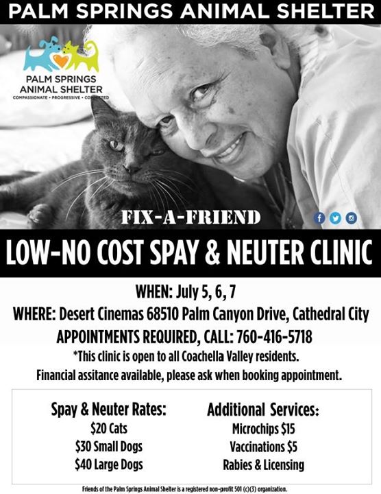 The City of Cathedral City has partnered with the Palm Springs Animal Shelter to offer a Low-No Cost Spay & Neuter Clinic for cats and dogs, July 5-7, 2015 by appointment only. Call (760) 416-5718 to schedule your appointment.