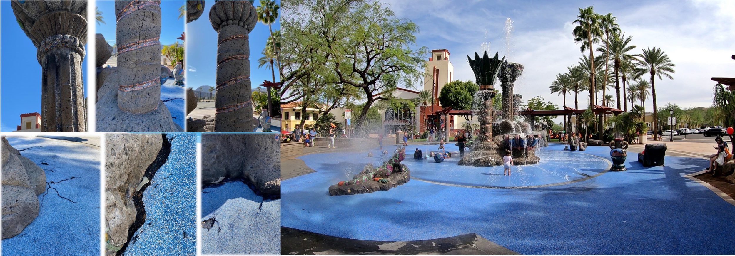 Currently, the fountain has several broken water statues, cracks in the main fountain pillars, multiple mosaic tiles missing, and the need to clean off years of mineral build-up on the overall feature. In addition, the blue soft foam surface surrounding the fountain and its water statues needs to be completely replaced due to constant water flow, water quality chemicals, and the active use of the fountain for recreational purposes.