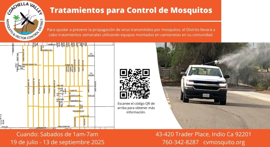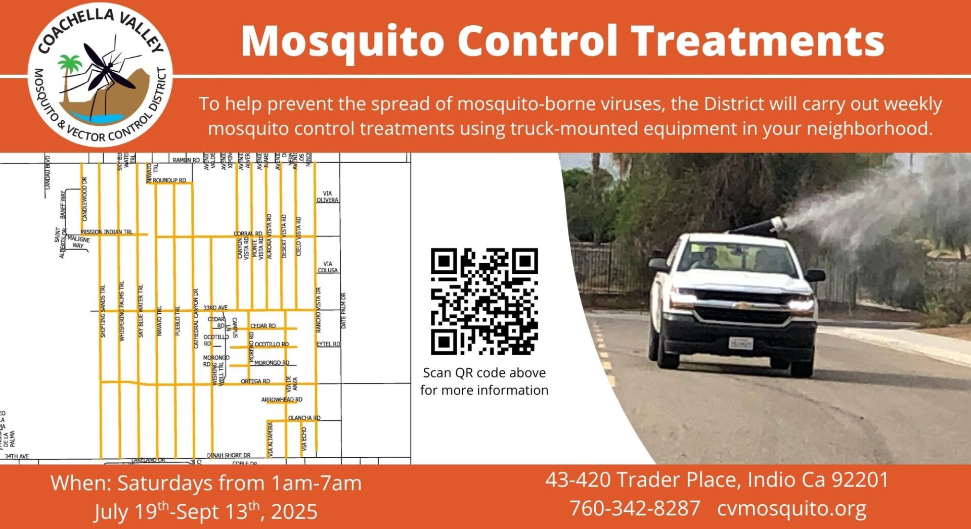 To help prevent the spread of mosquito-borne viruses, the Coachella Valley Mosquito & Vector Control District will carry out weekly mosquito control treatments using truck-mounted equipment in your neighborhood. Treatments will take place on Saturdays from 1am to 7am beginning July 19th and continuing through September 13th. For more information, please visit: Mosquito Control Treatments – Coachella Valley Mosquito and Vector Control District.