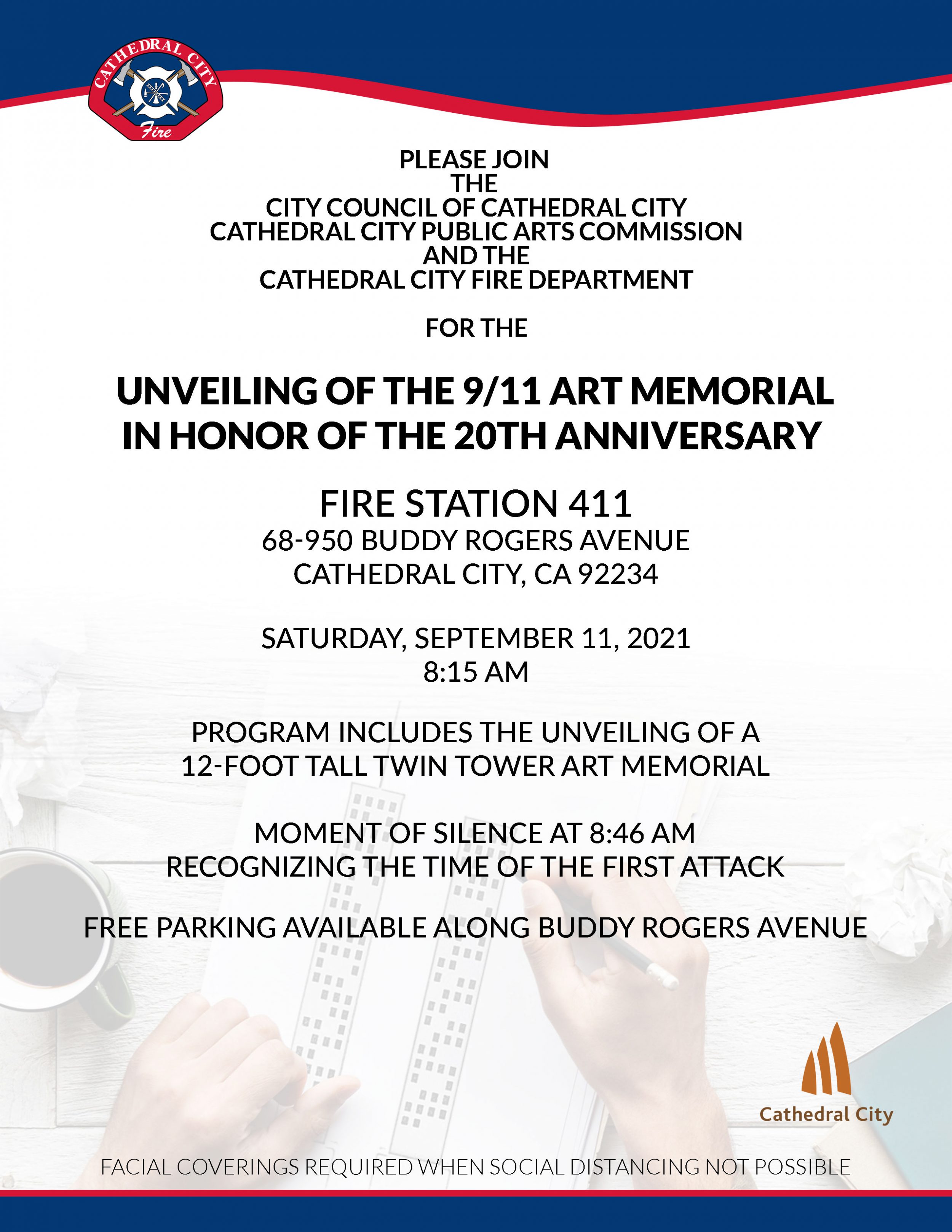 The City Council, Cathedral City Public Arts Commission, and the Cathedral City Fire Department invite you to the unveiling of a new 9/11 art memorial in commemoration of the 20th anniversary of the 9/11 terrorist attack upon our nation. The unveiling will take place at the new Cathedral City Fire Station 411, 68950 Buddy Rogers Avenue, South Main Entrance, in Downtown Cathedral City on Saturday, September 11, 2021, starting at 8:15 am and concluding with a Moment of Silence at 8:46 am in recognition of the time when the first plane struck the North Tower of the World Trade Center in New York City.