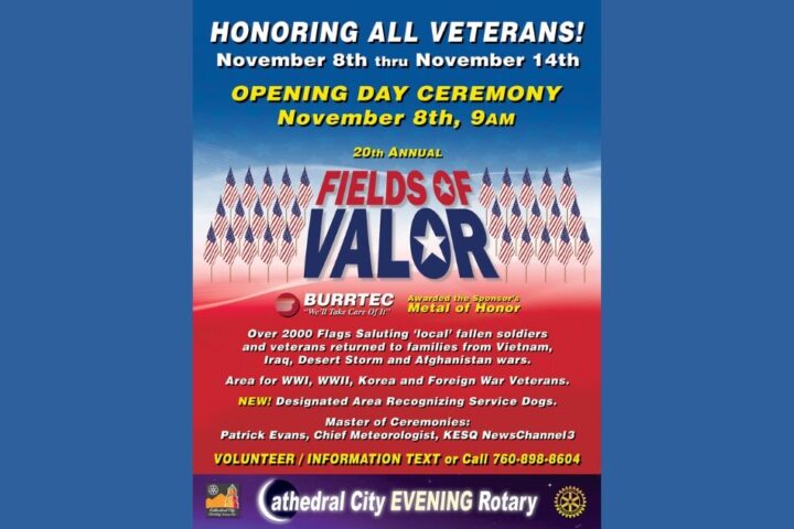 The Cathedral City Evening Rotary proudly presents the 18th Annual Fields of Valor Tribute Honoring Veterans, taking place November 8-14, 2025, at Patriot Park in Cathedral City. Event Overview Patriot Park, located at the intersection of Date Palm Drive and...Continue reading→