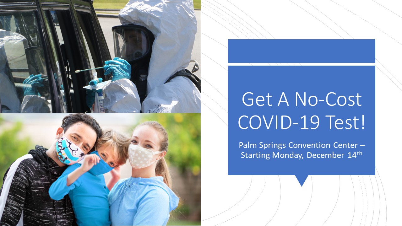 The Palm Springs Convention Center address is 277 N. Avenida Caballeros, Palm Springs.  All residents are encouraged to get tested. Testing helps contain the spread of coronavirus by isolating those who are COVID-positive so they can recover without passing the virus to others. Testing is for everyone, regardless of immigration status, insurance, or whether one has symptoms or not. There is no charge to the individual.