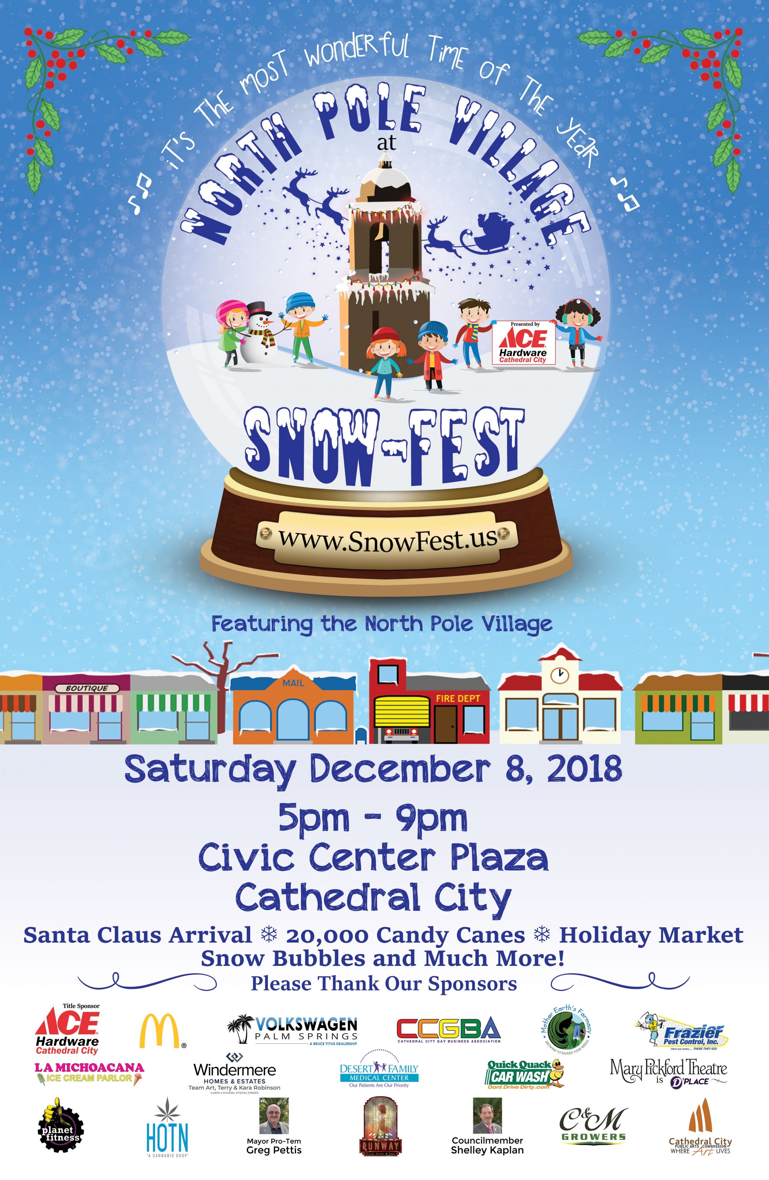 It’s the Most Wonderful Time of the Year! Plan to bring the entire family to the “North Pole Village at Snow Fest” on Saturday, December 8th from 5 pm to 9 pm in Downtown Cathedral City for holiday family fun. “North Pole Village” is a lit, Hollywood-Style Movie Set depicting “Main Street” at the North Pole, but located in front of City Hall. You will have an opportunity to take the perfect family holiday photo and enjoy its splendor.