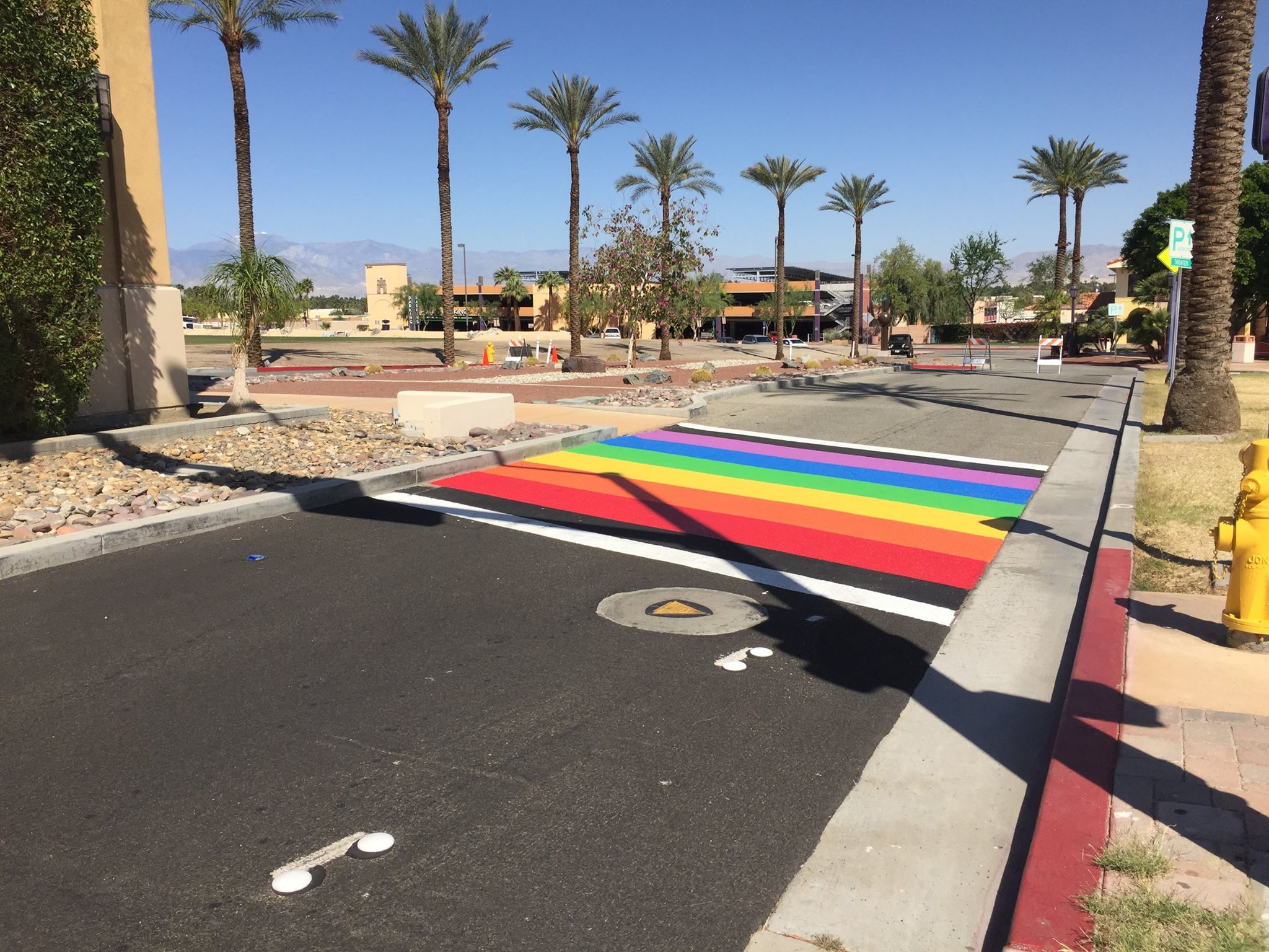 The unveiling of the “Rainbow Crossing” occurred near the Bell Tower in downtown along East Palm Canyon Drive at West Buddy Rogers Avenue. The “Rainbow Crossing” consists of painted stripes within a downtown crosswalk that matches the Rainbow Flag utilized by the LGBT community as a symbol of pride and diversity. Being a temporary street art piece, the crossing is an important step to recognize the historic progress in the civil rights movement and a kick-off to next week’s Cathedral City LGBT Days scheduled on March 25-27, 2016. A permanent Rainbow Crossing is in the planning stages.
