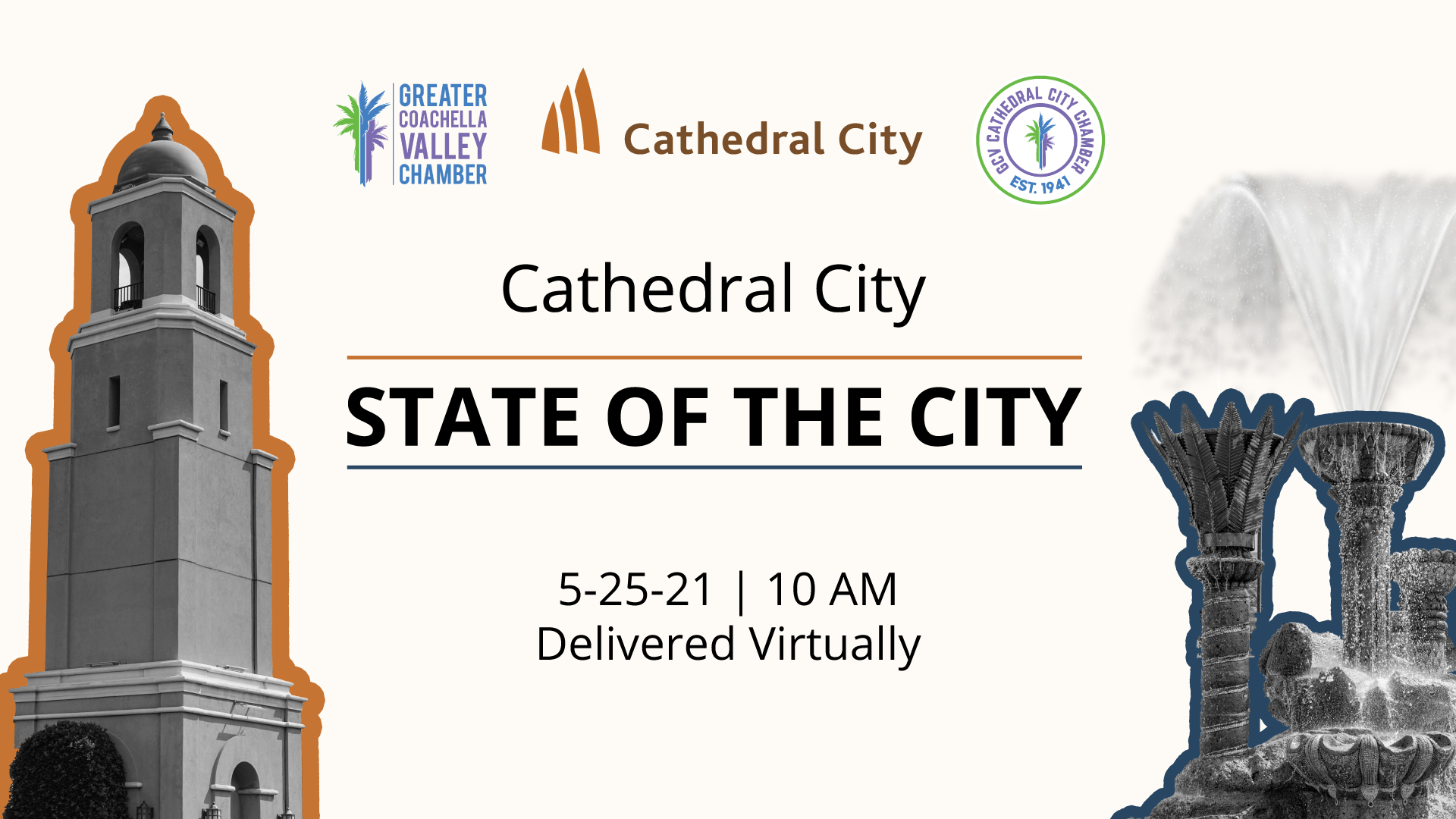 Are you wondering what is going on at the former Sam’s Club on Date Palm Drive or when the Ofelia Bringas Memorial Bridge on Cathedral Canyon Drive is going to be finished? Find-out this and more by watching the Virtual 2021 State of the City hosted by the Greater Coachella Valley Chamber of Commerce on Tuesday, May 25th at 10 am. Simply go to www.DiscoverCathedralCity.com and click on the LIVE link.