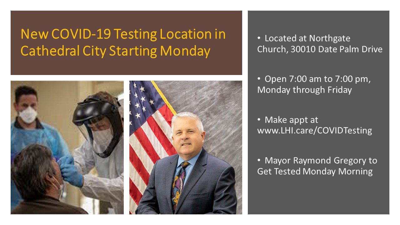 Cathedral City Mayor Raymond Gregory will get tested at the new site on Monday morning, the City of Cathedral City announced on Friday.