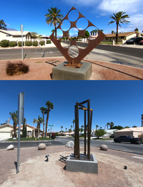 On Monday, City crews installed the “Swiss Cheese” art sculpture at the northwest corner of Panorama Park (Calada Road and Peladora Road). Commissioned by the self-taught artist, Simi Dabah, this beautiful metal art piece is left in its natural state, rusting to a warm patina. Mr. Dabah donated this sculpture to the Cathedral City Public Arts Commission many years ago. It was most recently placed near the police department in downtown but was moved to make room for the memorial for our fallen Cathedral City Police Officers David Vasquez and Jermaine Gibson, Sr.