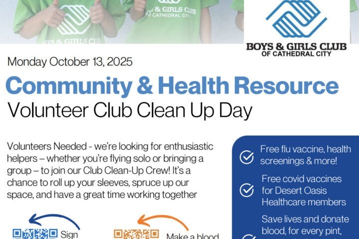 Please join the Boys & Girls Club of Cathedral City on Monday, October 13th, for their “Community & Health Resource Fair” and “Volunteer Club Clean Up Day.” Hope to see you there!