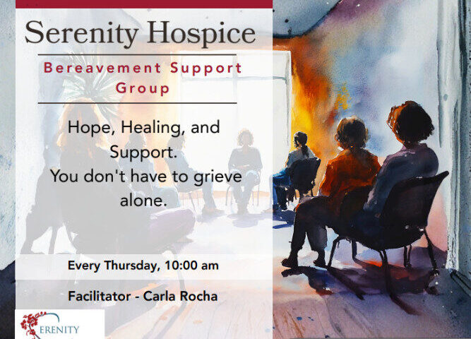 When: Every Thursday Time: 10am Facilitator: Carla Rocha Location: Cathedral City Senior Center 37171 W. Buddy Rogers Ave, Cathedral City, CA 92234 Find comfort and understanding at our weekly Bereavement Support Group facilitated by Serenity...