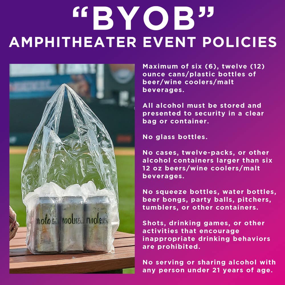 NEW THIS YEAR: BYOB will be permitted at all events except the March 25 CCHS Band & Choir Showcase. Please see our amphitheater BYOB policies below for guidelines and restrictions.