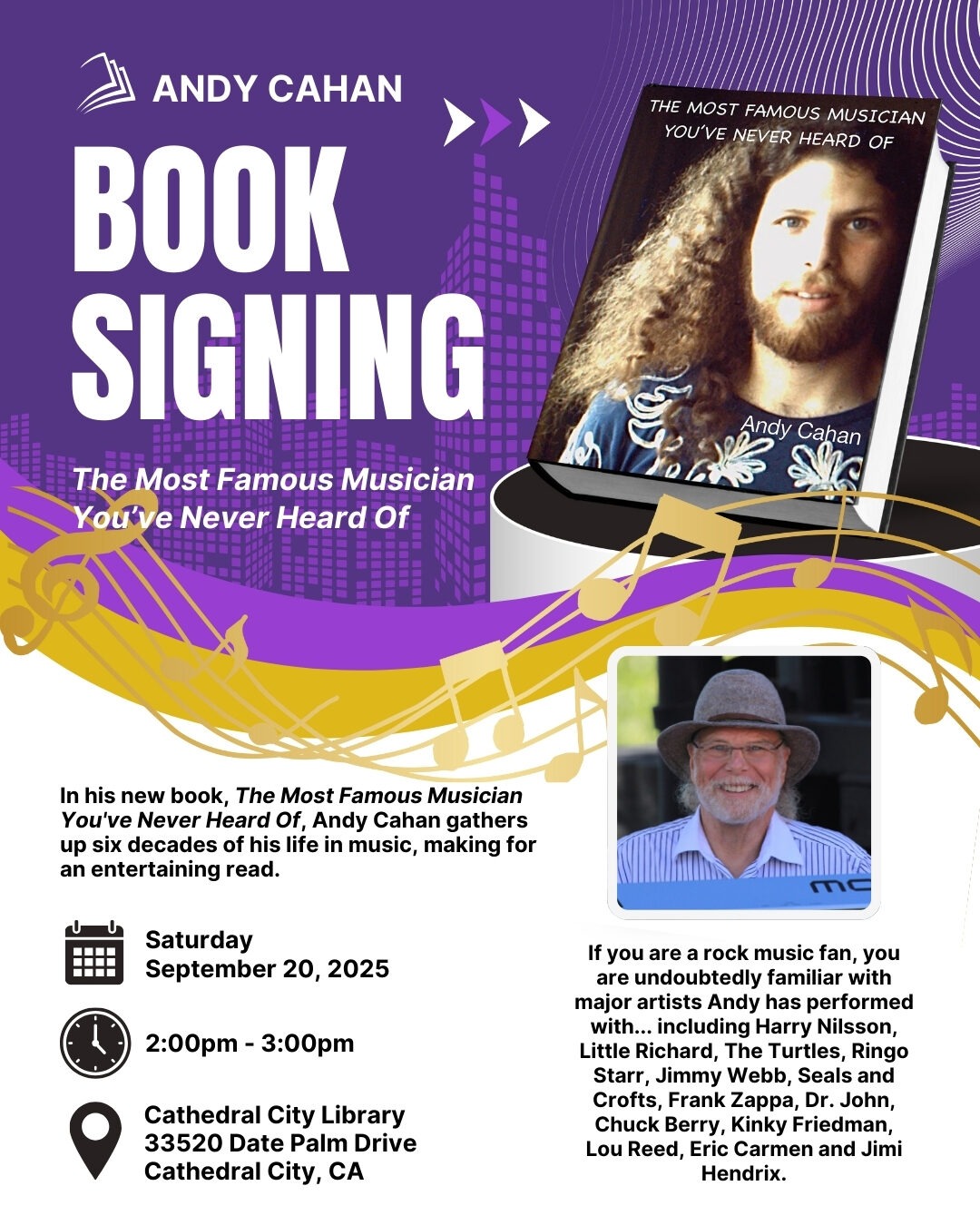 Host Conrad Angel Corral recently interviewed rock legend Andy Cahan about his upcoming book signing event for “The Most Famous Musician You’ve Never Heard Of,” taking place at the Cathedral City Library, located at 33520 Date Palm Drive, Cathedral City, CA. This entertaining event on Saturday, September 20, 2025, from 2:00 PM to 3:00 PM, features a video showing and Q&A session followed by the book signing.