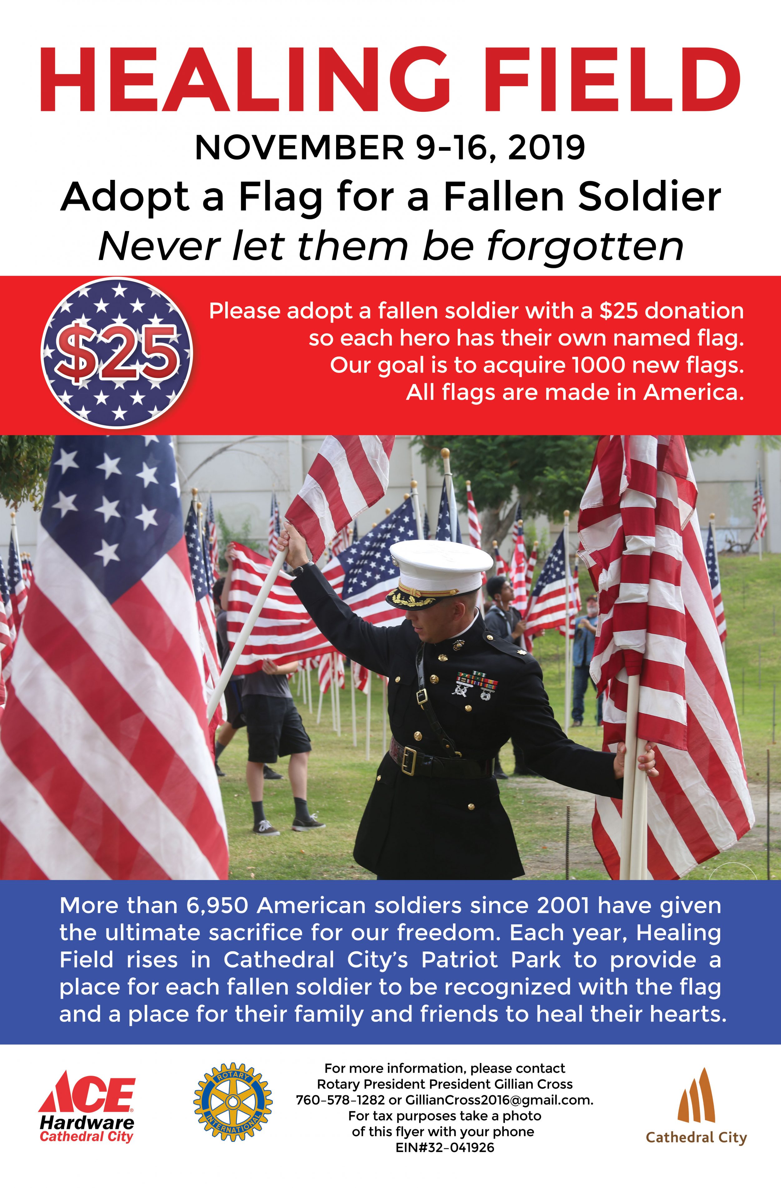 This 4th of July, please adopt a fallen soldier flag display by going to ACE Hardware Cathedral City at the corner of 30th Avenue and Date Palm Drive and sponsor a flag kit for $25.00. Each kit includes the flag, rebar, pole, name tag for the fallen soldier, and funds to support the project. All flags are proudly made in America. Your donation is tax deductible.