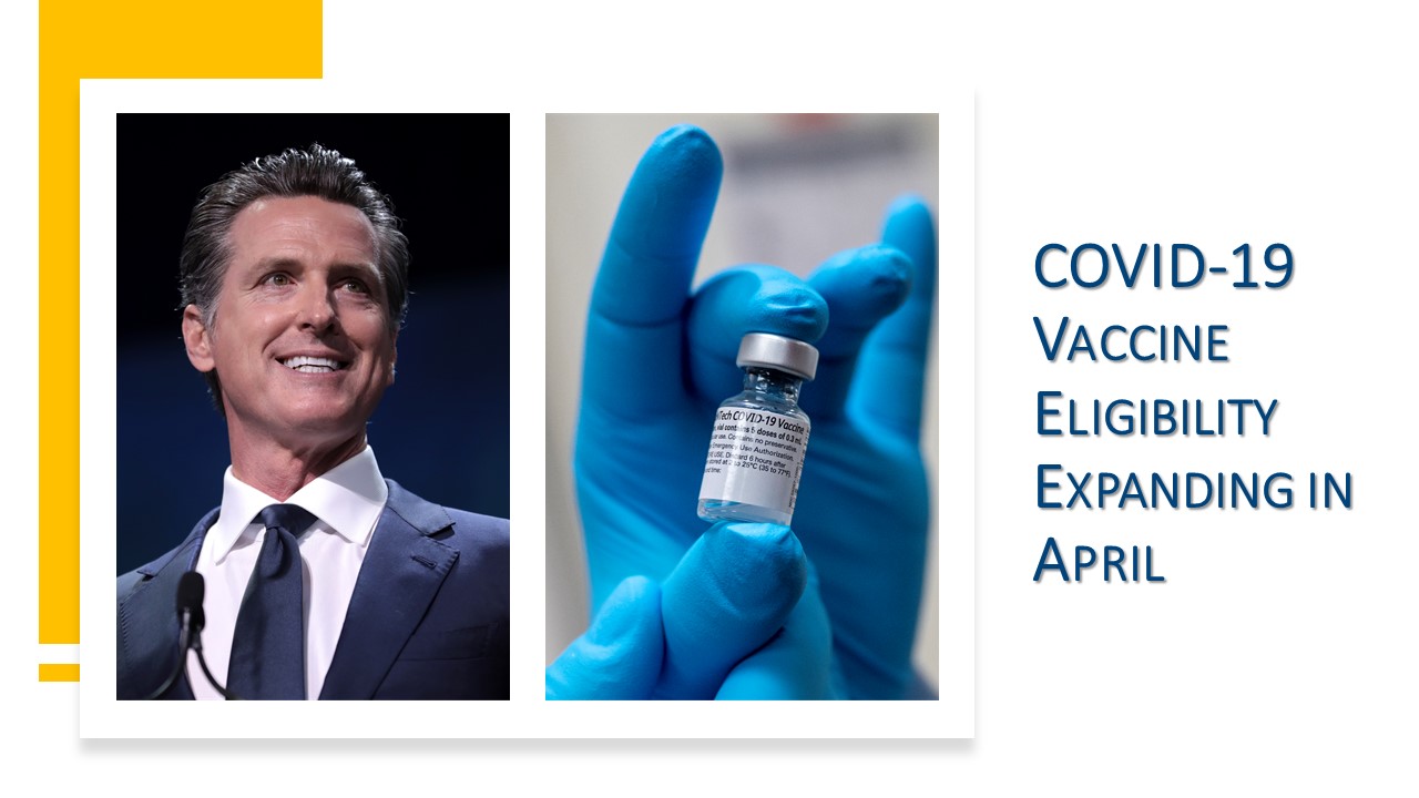 Governor Newsom announced that starting next Thursday, April 1, 2021, anyone over the age of 50 will be eligible to receive a COVID-19 vaccination.  Then, on April 15, 2021, anyone over the age of 16 will be eligible to be vaccinated.  This dramatic increase in pace is all due to stepped up manufacturing of the COVID-19 vaccines and increasing supplies.