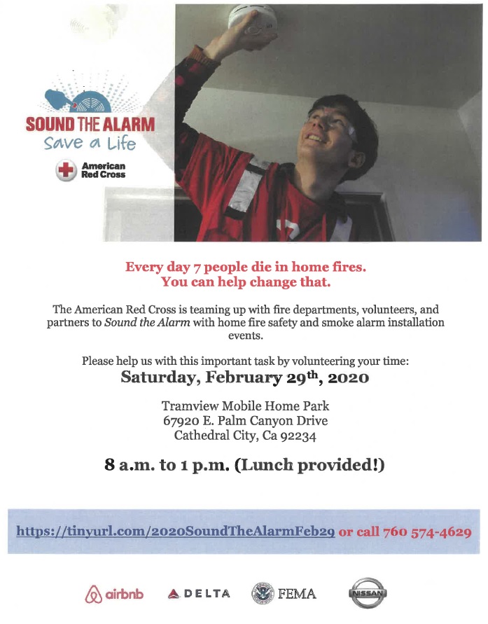 The Cathedral City Fire Department and the American Red Cross are seeking volunteers to help install smoke alarms on Saturday, February 29, 2020 at the Tramview Mobile Home Park from 8:00 am to 1:00 pm.  Lunch will be provided to those who volunteer.