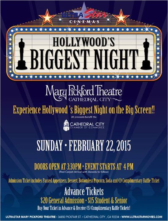 The Cathedral City Chamber of Commerce presents “Hollywood’s Biggest Night” at the Mary Pickford Theatre. This ticketed event includes walking the red carpet, appetizers, dessert, bottomless popcorn, soft drinks and 1 raffle ticket. Best of all, you get to watch the Academy Awards on the large screen.