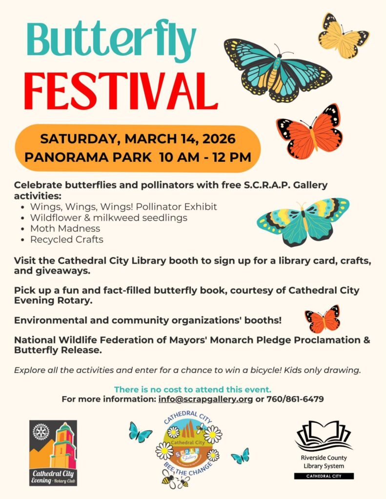 The City of Cathedral City and S.C.R.A.P. Gallery invite the community to celebrate butterflies and pollinators at the annual Butterfly Festival on Saturday, March 14, 2026, from 10 a.m. to 12 p.m. at Panorama Park. This free, family-friendly event features hands-on activities, environmental education, and community fun for all ages.