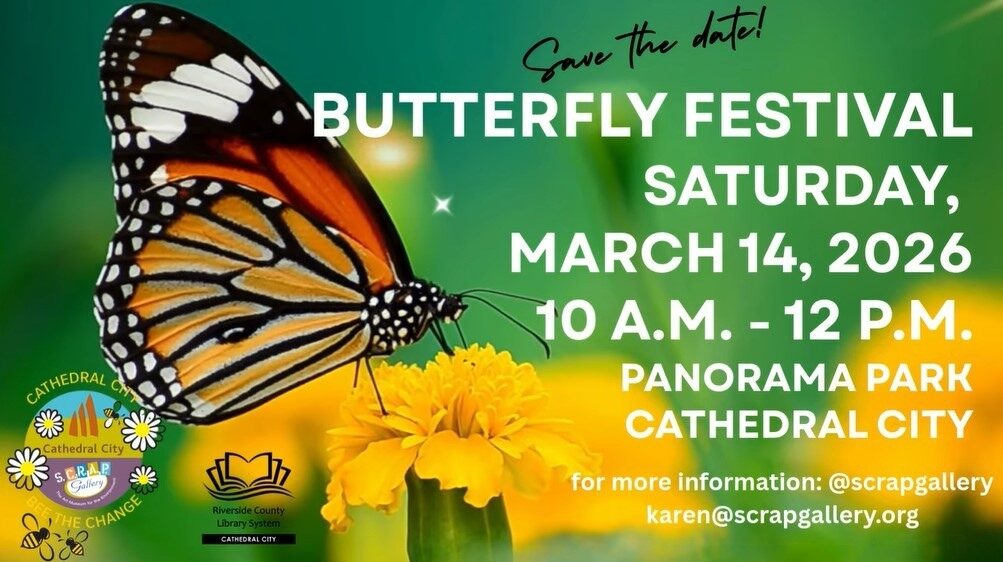 The City of Cathedral City and S.C.R.A.P. Gallery invite the community to celebrate butterflies and pollinators at the annual Butterfly Festival on Saturday, March 14, 2026, from 10 a.m. to 12 p.m. at Panorama Park. This free, family-friendly event features hands-on activities, environmental education, and community fun for all ages.